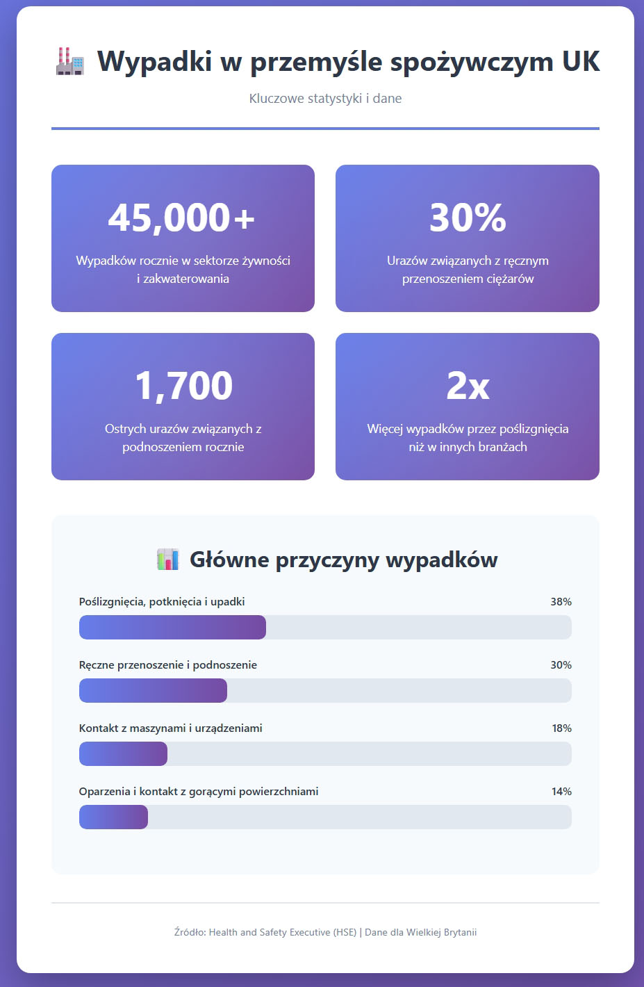 Statystyki publikowane przez Health and Safety Executive pokazują niepokojący obraz rzeczywistości w brytyjskim przemyśle spożywczym. Według danych HSE, ponad trzydzieści procent wszystkich urazów zgłaszanych w tej branży to urazy związane z ręcznym przenoszeniem i podnoszeniem ciężarów, co przekłada się na około tysiąc siedemset ostrych urazów rocznie. Sześćdziesiąt procent tych przypadków dotyczy sytuacji, w których pracownicy musieli podnosić ciężkie przedmioty bez odpowiedniego wsparcia czy wyposażenia. Warto też wspomnieć, że sam sektor żywności i zakwaterowania notuje rocznie ponad czterdzieści pięć tysięcy przypadków urazów związanych z pracą, co pokazuje skalę wyzwania, przed którym stoi ta branża.